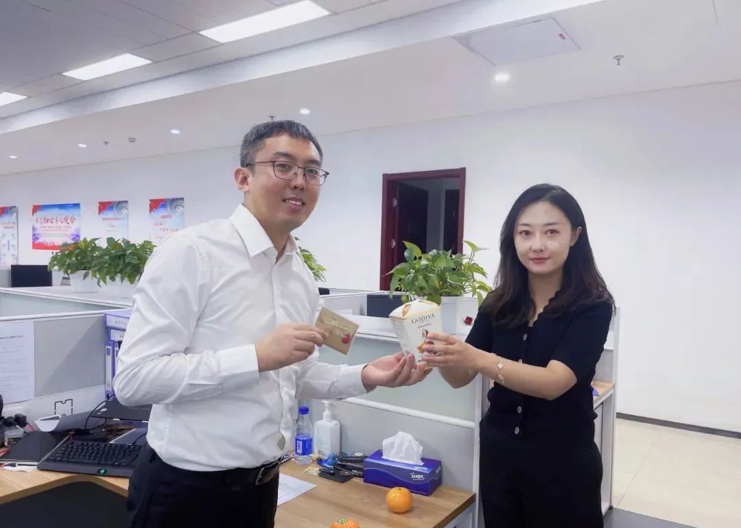 在活动中,公司为每位员工准备了巧克力和鲜花,还为每人精心准备了手写卡片,承载着感恩和激励之词,由公司领导分别送到每一位员工手中。